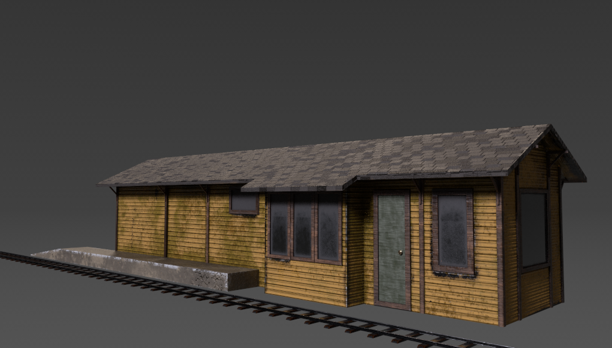 Starting on art, we have several new buildings in the works, including our basic freight/passenger depot (pictured), which has been modeled on small Southern Pacific Railroad depots you'll find all over California. We're also working on small and medium locomotive storage sheds.
